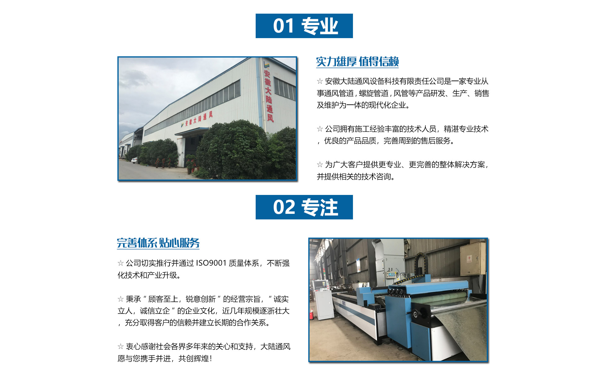 安徽大陸通風設(shè)備科技有限責任公司加工共板法蘭風管、螺旋風管、角鐵法蘭風管、插接式風管。價格合理。質(zhì)量保障。是國內(nèi)生產(chǎn)和研究通風管道的企業(yè),工廠坐落于經(jīng)濟發(fā)達的安徽省合肥市。公司配備了好的自動化流水線設(shè)備和先進的制作安裝技術(shù)。